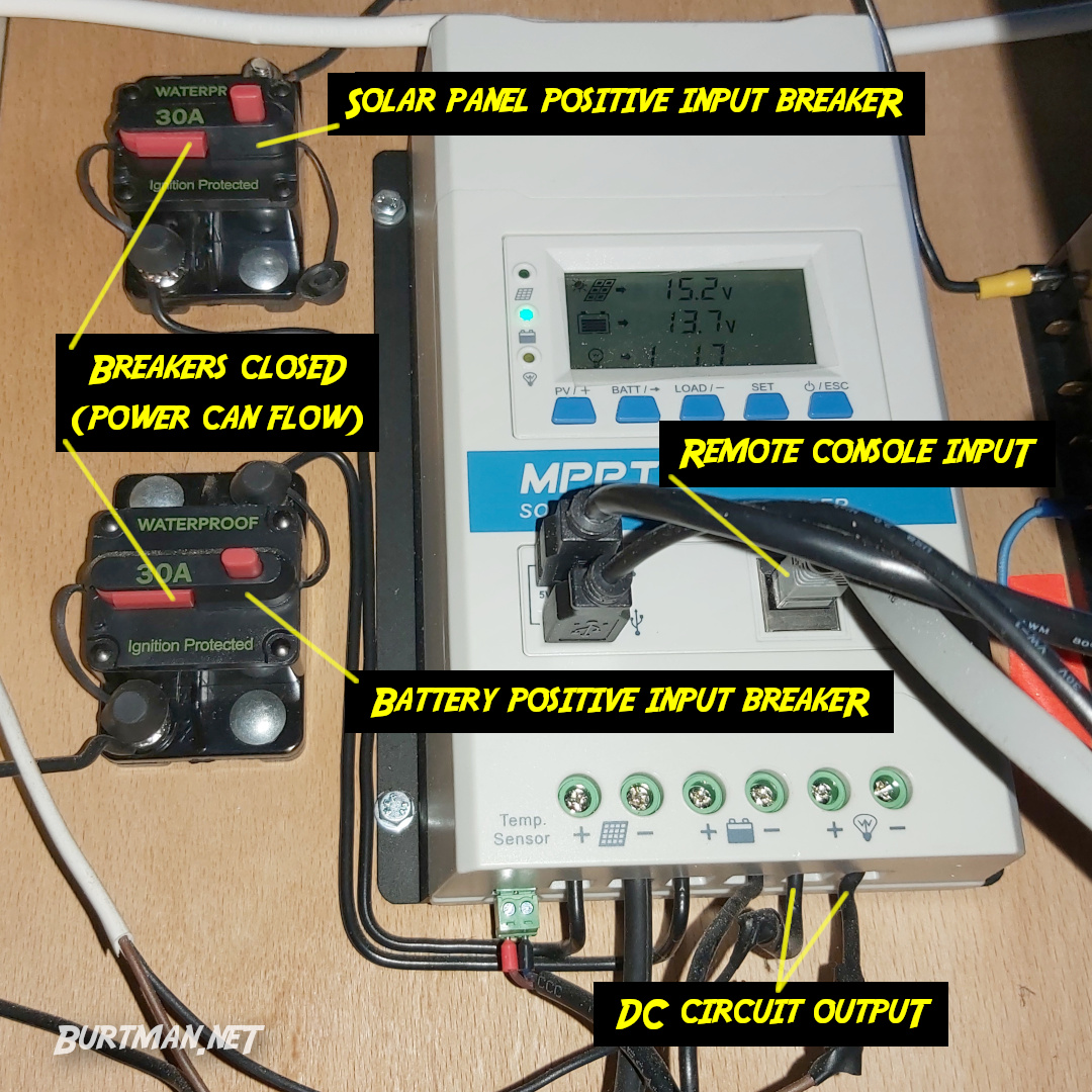 Solar power inputs are connected to breaker 1, so power coming in can be disconnected.